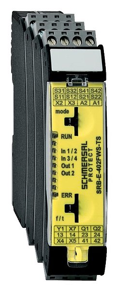 Nel più ampio parco prodotti tra i principali fornitori di componenti di sicurezza, tra gli oltre 20'000 prodotti e accessori, SCHMERSAL vanta un particolare modulo di sicurezza multifunzione, capace di sorvegliare un riparo ad uno o due canali, con o senza controllo del cortocircuito, unitamente alla possibilità di ritardare lo sblocco dello stesso in funzione della velocità rilevata di un asse pericoloso.