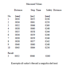 Il tempo di arresto viene rilevato misurando la reazione della macchina e la reazione del dispositivo di protezione dopo l’invio del segnale di fermo. L’attuatore viene attaccato al dispositivo di protezione utilizzando una morsa a molla, mentre il trasduttore viene fissato al telaio della macchina. La misurazione è ripetuta 10 volte, in accordo con la norma EN ISO 13855:2010.