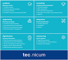 tec.nicum è la business unit del Gruppo Schmersal per i servizi nell’ambito della sicurezza delle macchine e degli impianti che offre a tutti i produttori di macchine ed end-user una consulenza completamente indipendente su tutte le più recenti normative di legge e un supporto nel garantire che le loro macchine siano progettate per essere conformi agli standard di sicurezza.