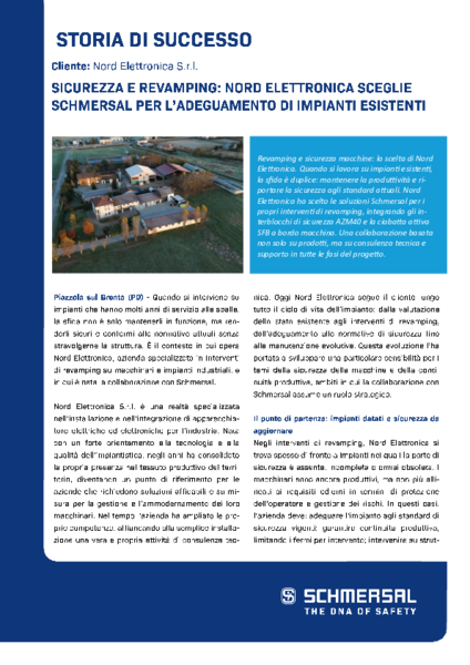 Piazzola sul Brenta (PD) - Quando si interviene su impianti che hanno molti anni di servizio alle spalle, la sfida non è solo mantenerli in funzione, ma renderli sicuri e conformi alle normative attuali senza stravolgerne la struttura. È il contesto in cui opera Nord Elettronica, azienda specializzata in interventi di revamping su macchinari e impianti industriali, e in cui è nata la collaborazione con Schmersal.